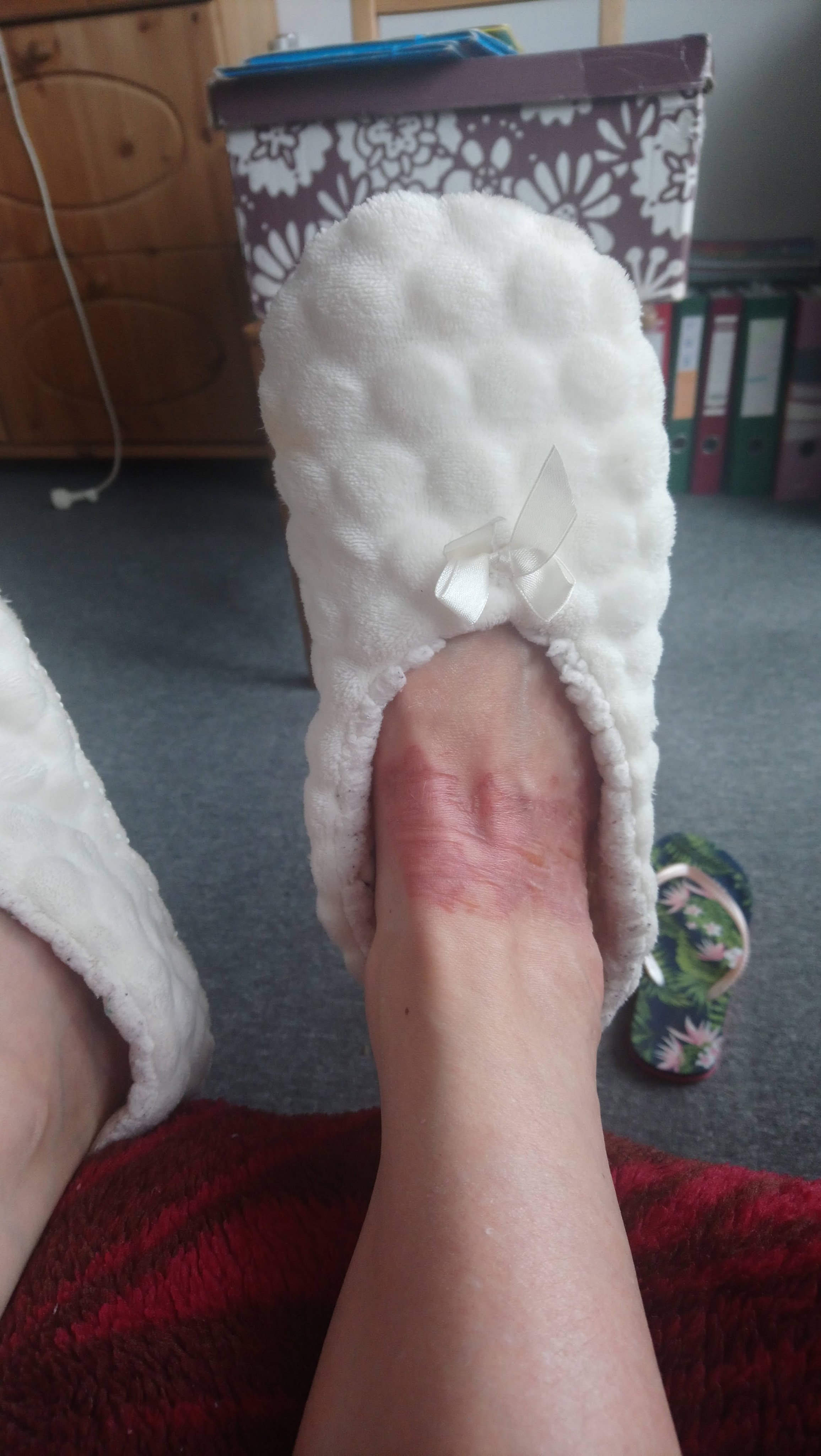 I dlatego właśnie, jak już najpierw tylko to przeczytałam, by zwilżyć go jednak tą wodą, to dałam go sobie zaraz pod pachy [jeszcze nawet super nie ogolone, hehe, bo uczynię to dziś, jak wezmę kąpiel 😉]. Ale jeszcze o tym w 100% nie wiedząc, bo coś mi się znowu tylko wydawało…, postanowiłam w takim razie zastosować go także na tą teraz już bliznę na stopie i to w dodatku obecnie nawet trochę bolącą, jak stoję… ze względu chyba na to, iż ta skóra się jednak w tym miejscu hm… marszczy (?). Postaram się tu Wam zaraz pokazać, co mam na myśli: