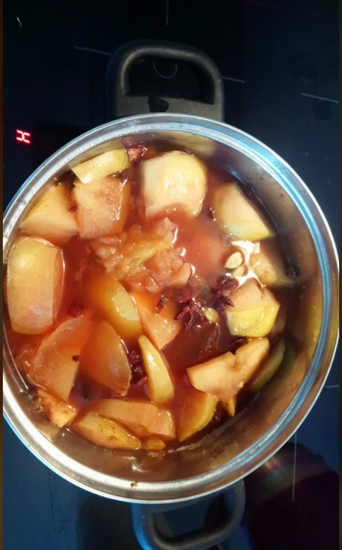 to teraz jeszcze dodam coś a propos tego kompotu… Słuchajcie, Mała Mi udała się po ten anyż właśnie, bo miała jeszcze i suszone śliwki, i gruszki… , i nawet zakupiła również jabłka [bo znowu pierwotnie myślała, że może upiecze na te wolne dni ponownie to ciacho z płatkami owsianymi…], jedna tak nie uczyniła, to pomyślała, iż wykorzysta po prostu te jabłka również do tego kompotu! A wkroiła do niego, moi drodzy również surowy, obrany imbir w plasterkach, dodała także i goździki i ziarna kardamonu, hehe, także muszę Wam powiedzieć, że z tej Małej Mi jest naprawdę wspaniała artystka!