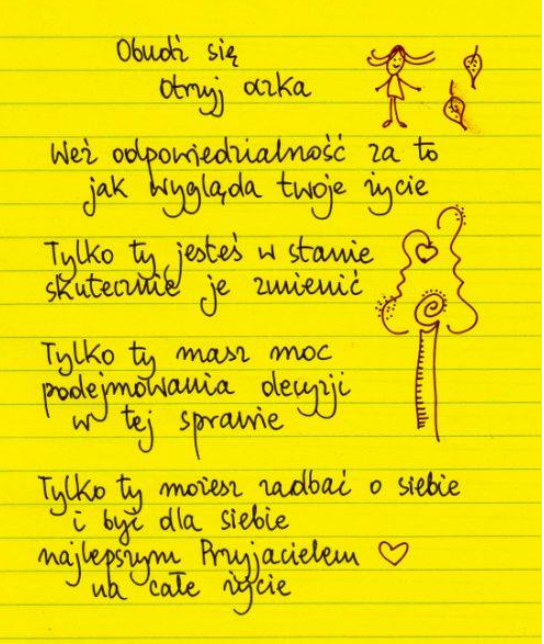 Właśnie tak sobie pomyślałam ćwicząc tu jeszcze na tej macie, uśmiechałam się i mówiłam sama do siebie, że to jest przecież moje życie i tak wiele tu zależy tylko ode mnie! I to ja powinnam wziąć przede wszystkim odpowiedzialność za to kim jestem! A pomyślałam jeszcze sobie, że, do cholery, nie po to tyle przeżyłam, by teraz tylko liczyć na pomoc drugiej osoby. Choć jestem tego doskonale świadoma, że tak naprawdę nigdy wcześniej nie mogłam tak naprawdę w pełni na nikogo liczyć, bo przecież nie dane mi w ogóle było= pobyć sobie nawet prawdziwym dzieckiem, ale do diaska, tak sobie dalej myślałam, że: