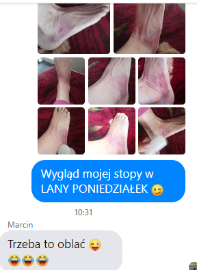Jeszcze medytując już właściwie wiedziała to niemal, iż dziś z całą pewnością nie będzie się już gimnastykować! Po prostu tego nie czuła… A już bardzo dobrze o tym wie, aby niczego nie wymuszać, tylko słuchać siebie, tego co mówi do niej jej własne serce/ dusza i ciało. Zatem po tym, jak już cyknęła fotki tej swojej PIĘKNEJ JUŻ STÓPCE i przesłała je dalej swojej mamie, bratu przez Messenger’a…: A następnie również Zalwie, ale tej już tylko tą fotkę, którą widzicie jako 3cią na górze. I jak Kamyk jej odpisał, że trzeba to oblać, hehe, tak ta znajoma odpisała po prostu, że w majówkę będzie już całkiem dobrze 🙂