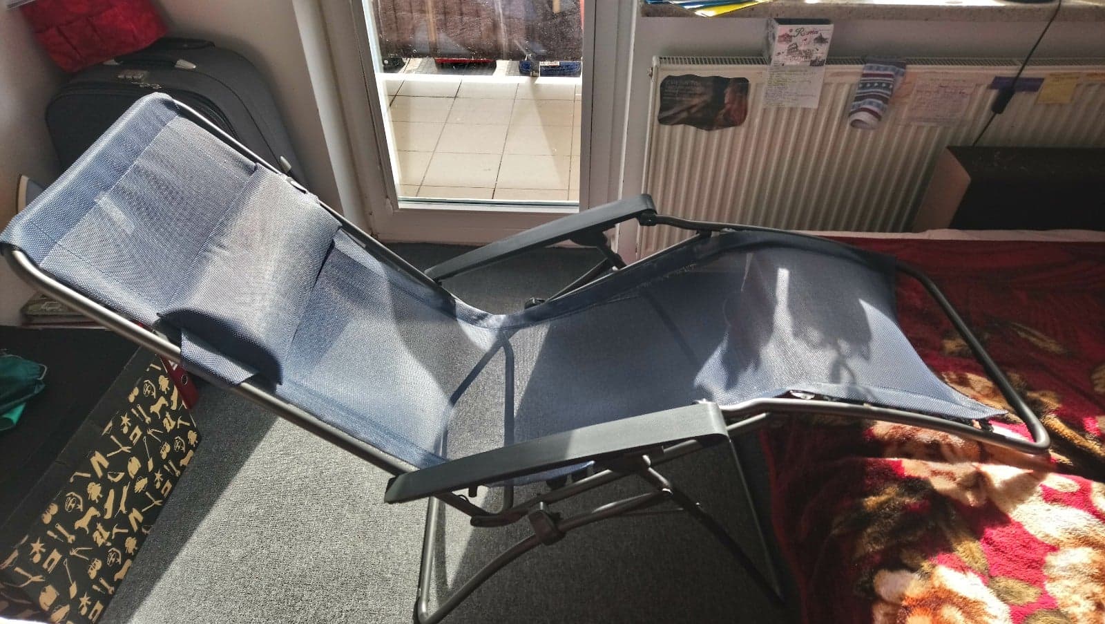 Za moment dostrzegłam, że tak jednak cudnie mi tu słonko wpada do pokoju… I wtedy właśnie już postanowiłam postawić mój leżak w takim miejscu, abym leżąc na nim miała również to słońce na sobie, a przede wszystkim na swojej twarzy! I tak go właśnie przeniosłam… A tak szalenie kombinowałam, [Leszcze Kombinuj Dziewczyno] jakby go tu ustawić, abym miała te słoneczne promienie również na swojej buzi… i właśnie wtedy ustawiłam go tak wręcz komicznie, bo stał niby swoimi nogami na podłodze…, jednak ta część, na której później znajdowały się moje nogi i stopy, była już normalnie oparta na moim łóżku 😜.