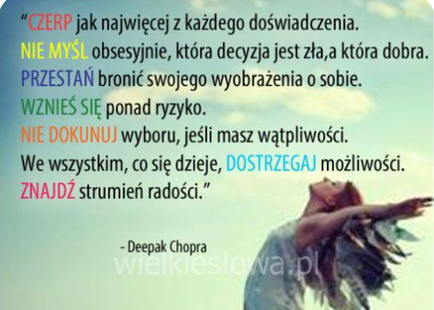 Otwieram się na obfitość. Obfitość to energia, którą zapraszam i z którą rezonuję. Odpuszczam lęk o pieniądze, znajdując w sobie pełnię bezpieczeństwa. NASTAWIAM SIĘ NA DAWANIE I BRANIE, BO WIEM, ŻE BOGACTWO TO RUCH I PRZEPŁYW. Czuję ogromną wartość swojego istnienia. A moje istnienie warte jest każdych pieniędzy. Mam w sobie wiele talentów, a moje umiejętności mogą służyć innym. Otwieram się na nieznane, a jednocześnie mogę poczuć się bezpiecznie.