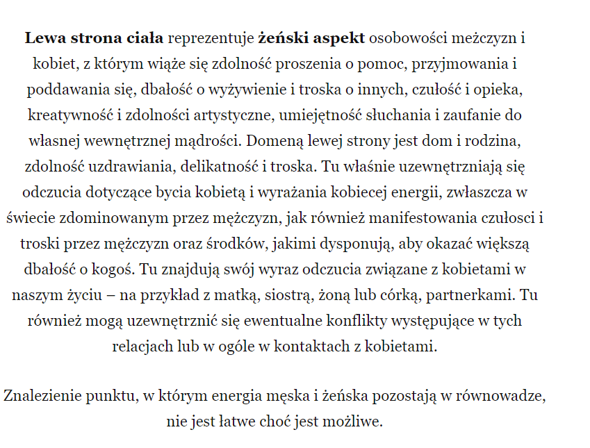To wcale nie jest dla mnie takie teraz znowu łatwe… wierzyć w to wszystko… nie dość, że nie otrzymałam miłości w dzieciństwie [czego moja mama kompletnie nie była & NIE JEST nadal w ogóle świadoma…] Z tego też powodu wciąż mam do niej ogromny żal o to [stąd prawdopodobnie ten ból, który odczuwam po lewej stronie swego organizmu…] boooszeee właśnie znowu płaczę…, gdyż odkryłam potwierdzenie tego na tej stronie: https://massagelomi.wordpress.com/2016/01/10/kobiecosc-i-meskosc-prawa-i-lewa-strona-naszego-ciala/
