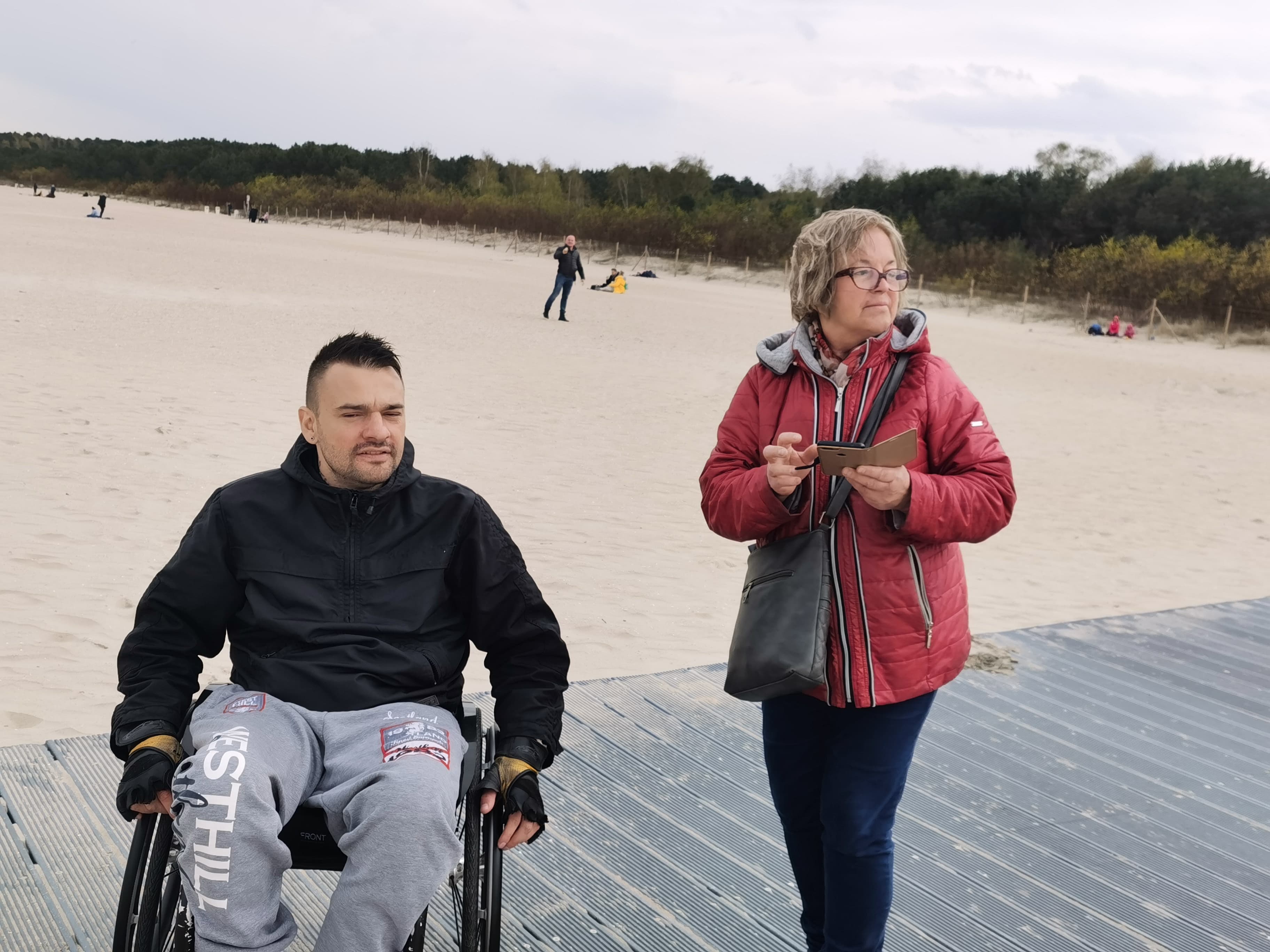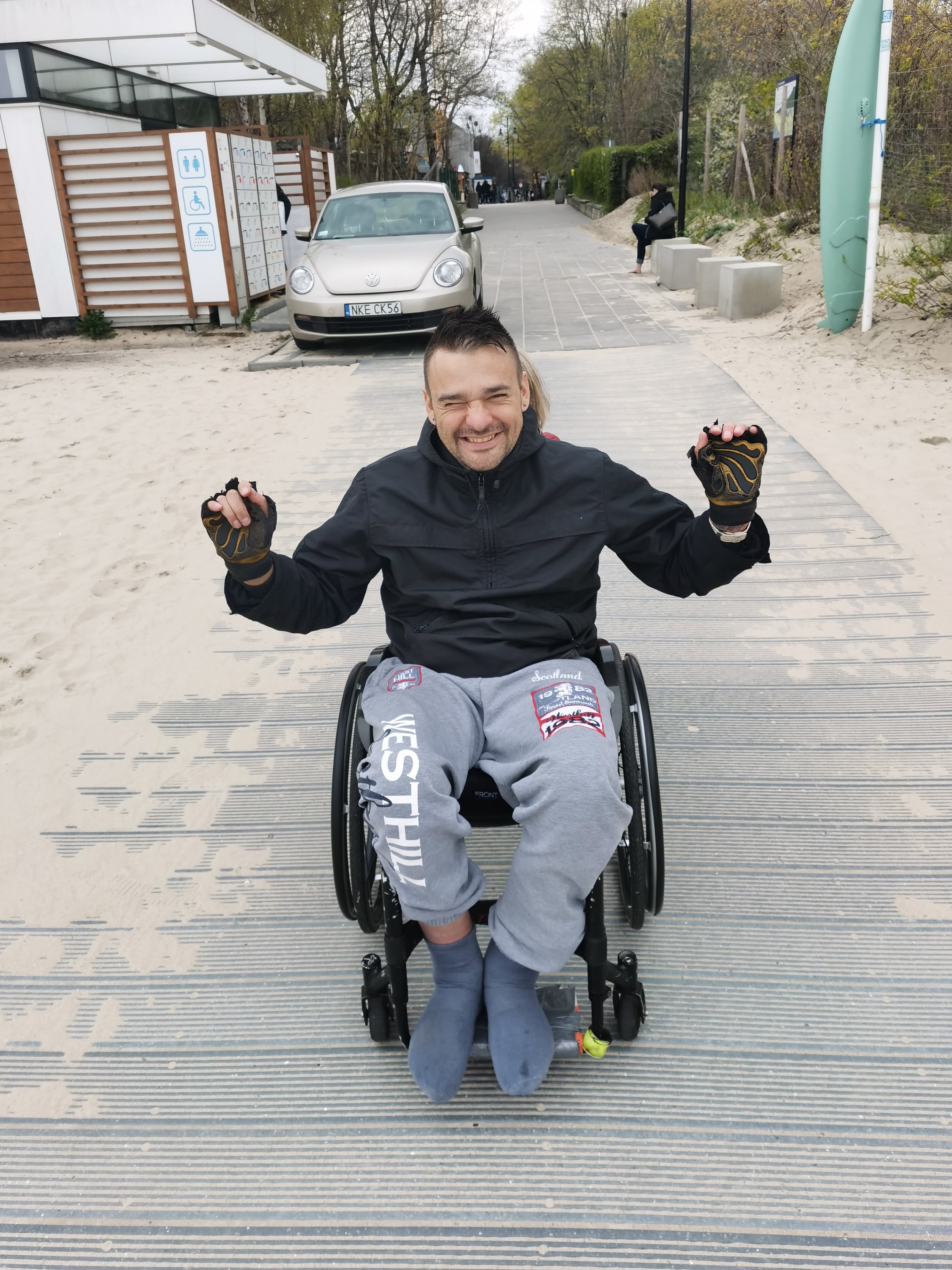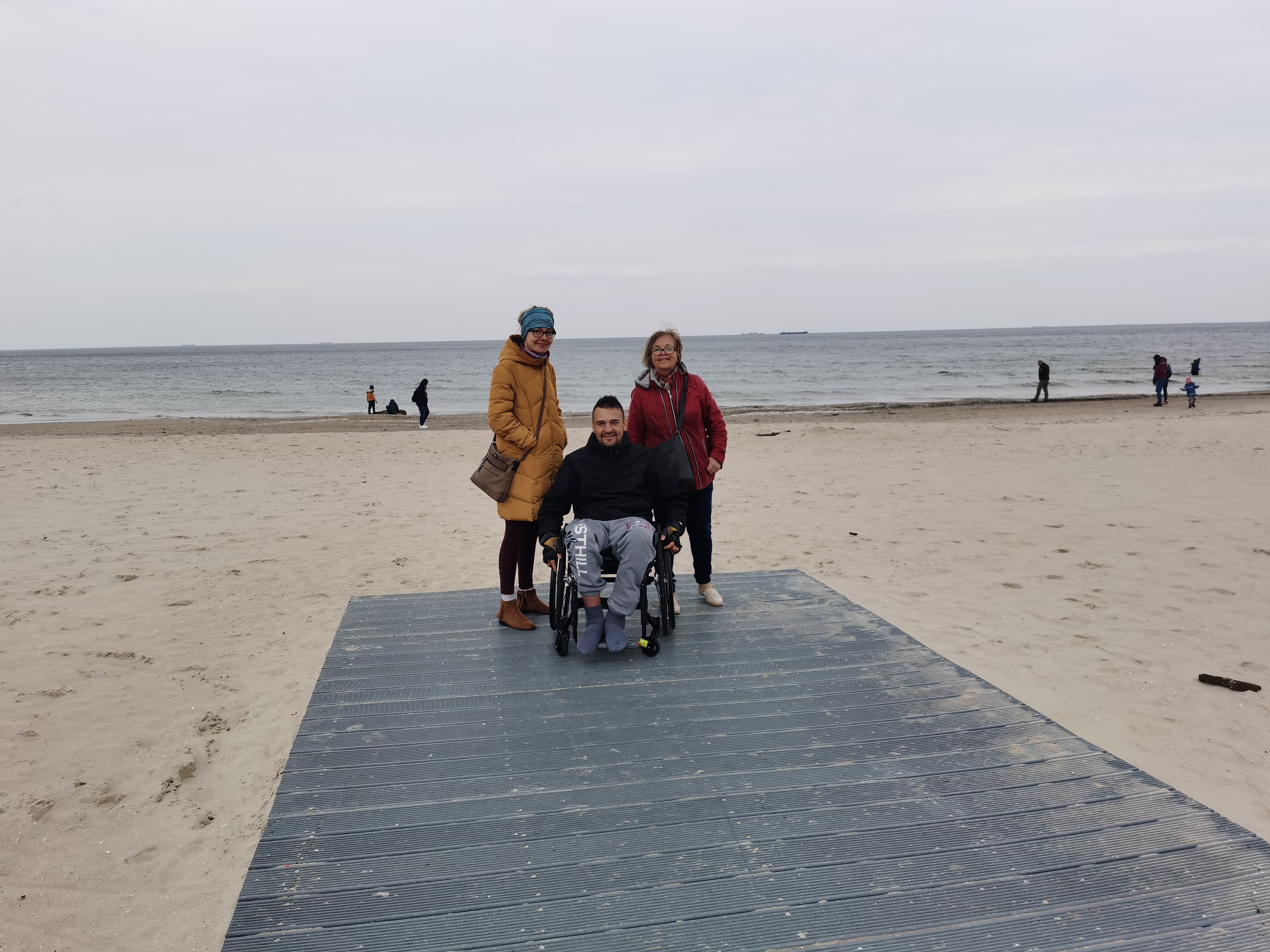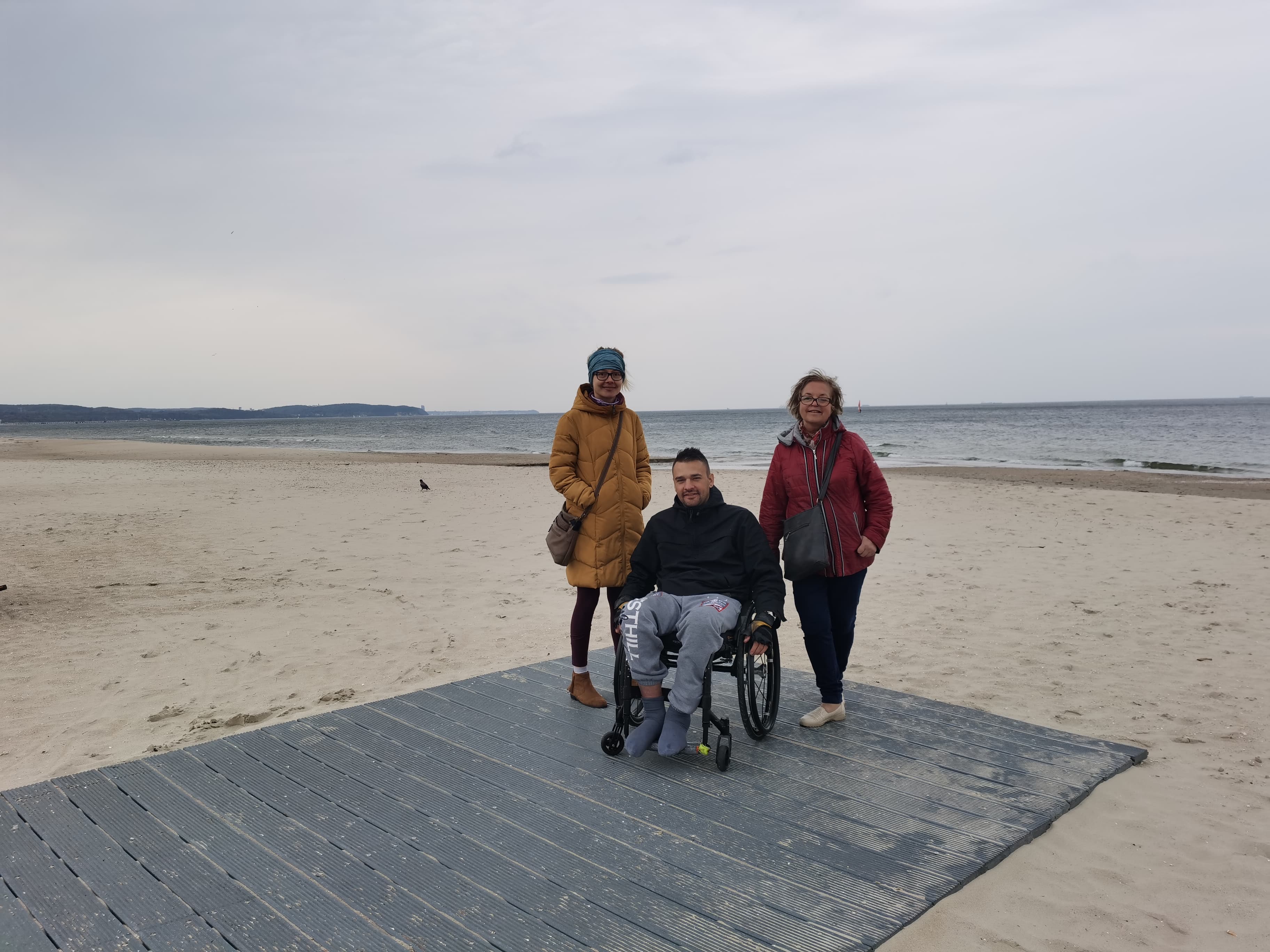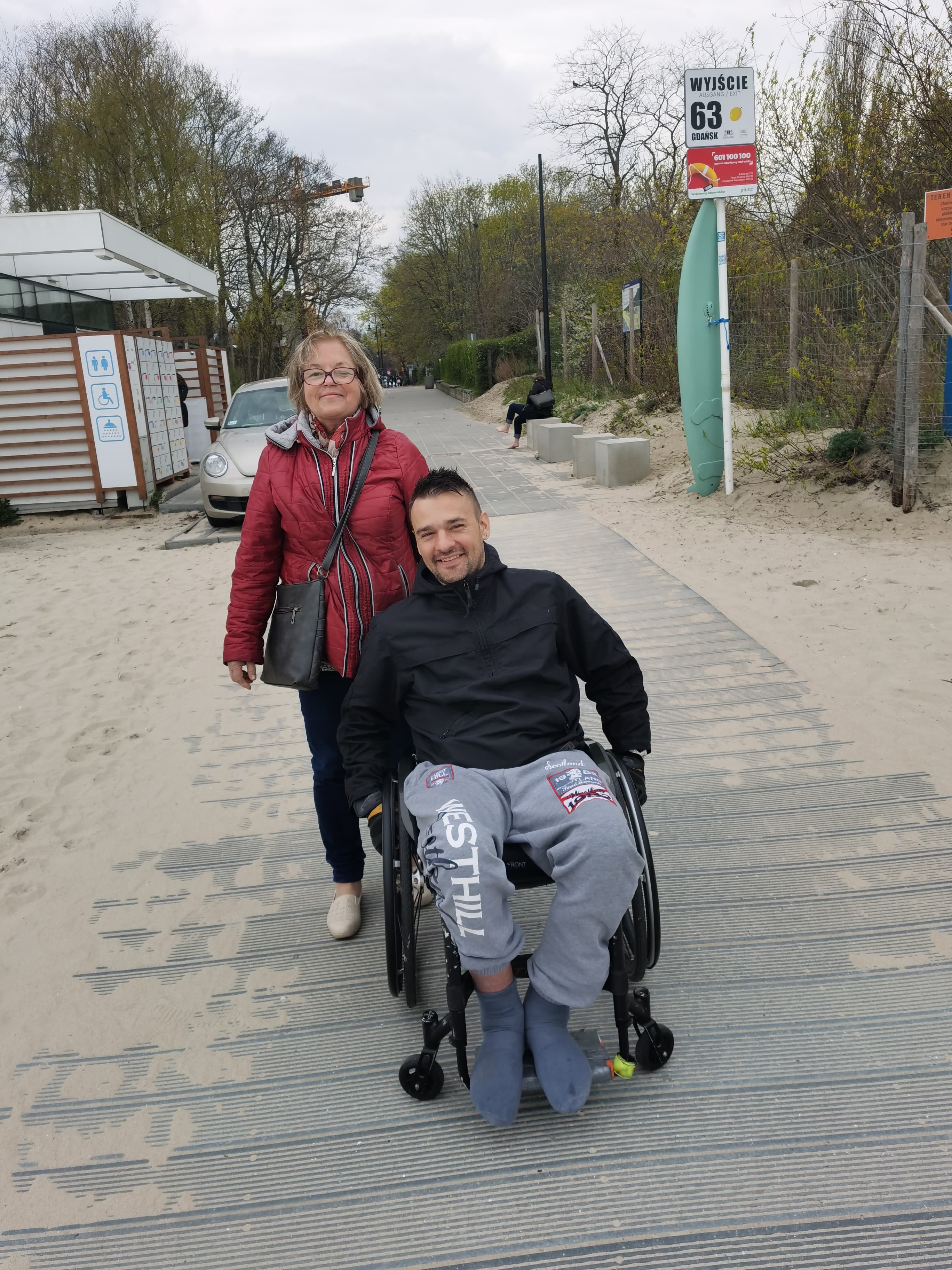 I znowu myślę sobie, boooszeeee, dlaczego ja sama na to nie wpadłam? Że przecież jest oczywistym, iż jak ktoś przyjeżdża z innego miasta, to z pewnością chciałby przede wszystkim pojechać nad morze, spędzić właśnie tam choć troszkę czasu… Tu muszę przyznać, że ponownie czułam się jak taki trochę głupek, bo to nie ja tylko ON SAM wpadł na pomysł, by pojechać jednak do Brzeźna, gdzie jest właśnie ten pomost umożliwiający wjazd wózkiem na tą plażę…