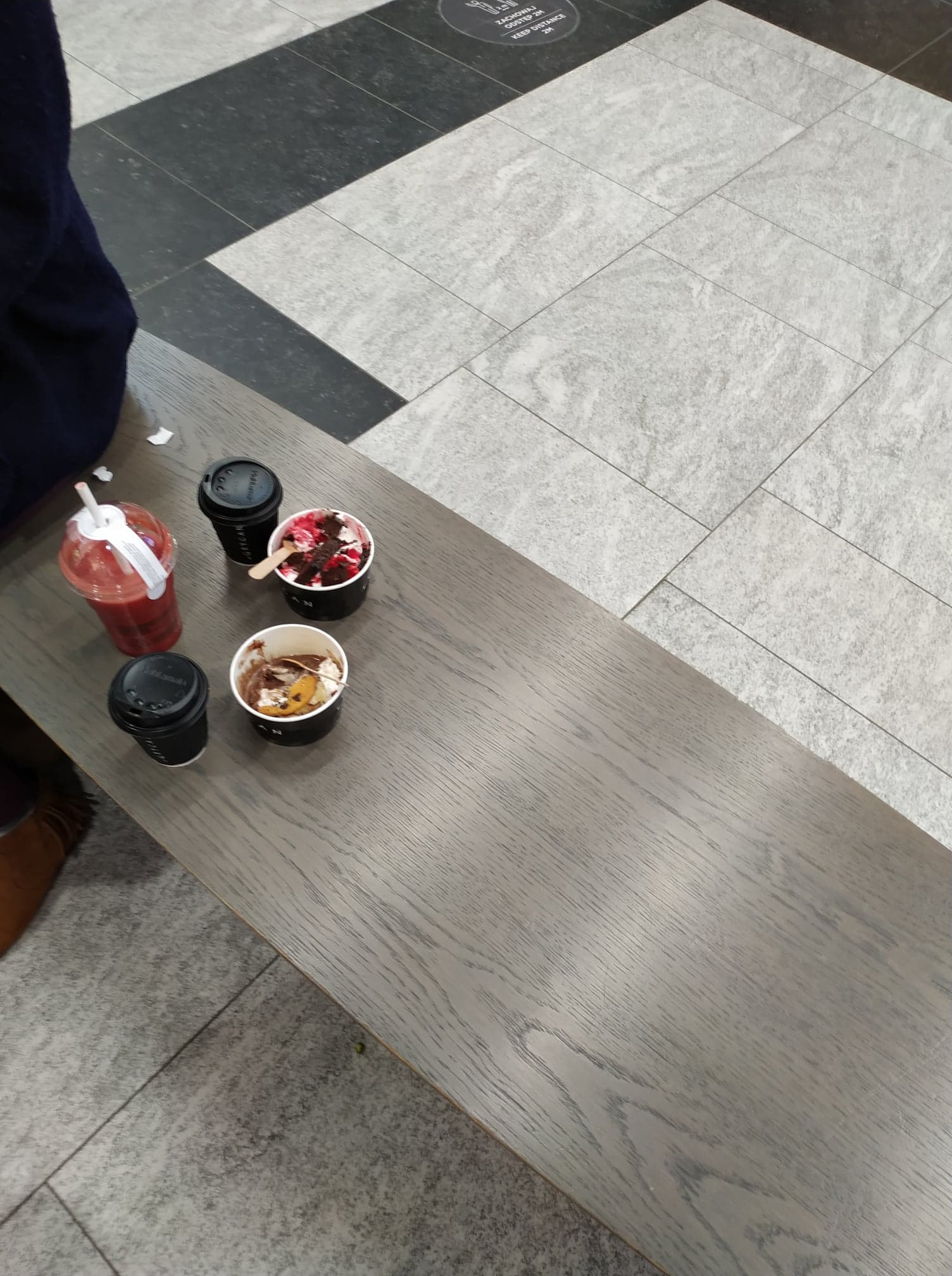 Ostatecznie jednak BÓG/ WSZECHŚWIAT wysłuchał moich modlitw i próśb! Choć uwierz mi, to było dla mnie ponownie trudne zadanie… A tak sobie właśnie w takich momentach myślę, jak bardzo tu wychodzi, jaką ja wciąż jestem jednak słabą/ mało odporną psychicznie tą osobą… Pierwsze co, jak tam przyjechaliśmy, to oczywiście zaliczyliśmy ten kibelek… Po zrobieniu, zawołał mamę do środka, by mu pomogła… Ja stałam tam na zewnątrz i znowu zaczynało być mi ciężko… Następnie udaliśmy się jeszcze i po kawę, i lody, Marcin kawy nie pija, więc wybrał sobie takie truskawkowe smoothie, czy może raczej był to po prostu shake… Następnie zjechaliśmy windą całkiem na parter, gdzie, na całe szczęście, stały te ławki… I na nich można było sobie przysiąść… Zatem po zwiedzeniu wszystkich pięter [bo Marcin bardzo chciał wszystko zobaczyć] i nawet wychodziłam razem z nim na te balkony tam, co widać na poniższych zdjęciach, dalej zaś już przysiedliśmy sobie tam właśnie w spokoju na tej ławce…