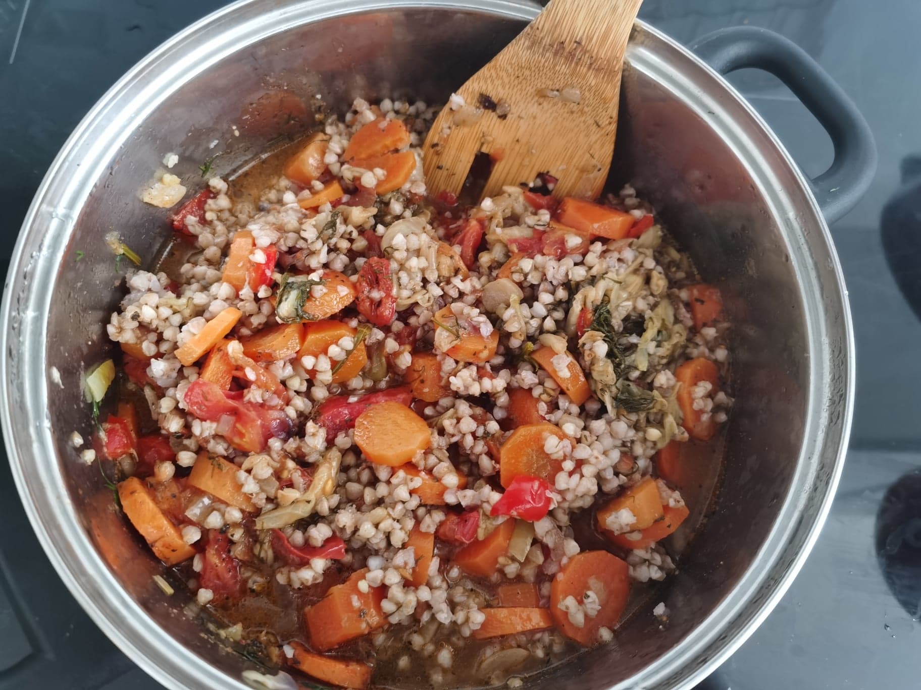 Ahhh, daj spokój, wczoraj byłam już tak ponownie tym wszystkim zdegustowana…- bo sama wiesz, jak ja kocham wręcz gotować… ale rozkminiłam sobie tylko, że przecież najlepiej, bym jeszcze z samego rana tego jednak dokonała, bo później, jak już wrócę z tego gabinetu stomatologicznego, to nie będzie już mi się chciało niczego dalej wymyślać… Tym bardziej, że to był mój dzień niejedzenia przecież…. A dodałam tam to, co miałam, czyli i kapustę, marchewkę, pomidory, kaszę, podsmażyłam nawet do tego jeszcze i cebulę, i dodałam również czosnek oraz resztkę papryki.. I właśnie takie danie mi z tego wyszło… zalałam to również tym własnoręcznie robionym bulionem… Jak jeszcze wczoraj się z tego nawet cieszyłam, tak dziś już znowu umieram wręcz…