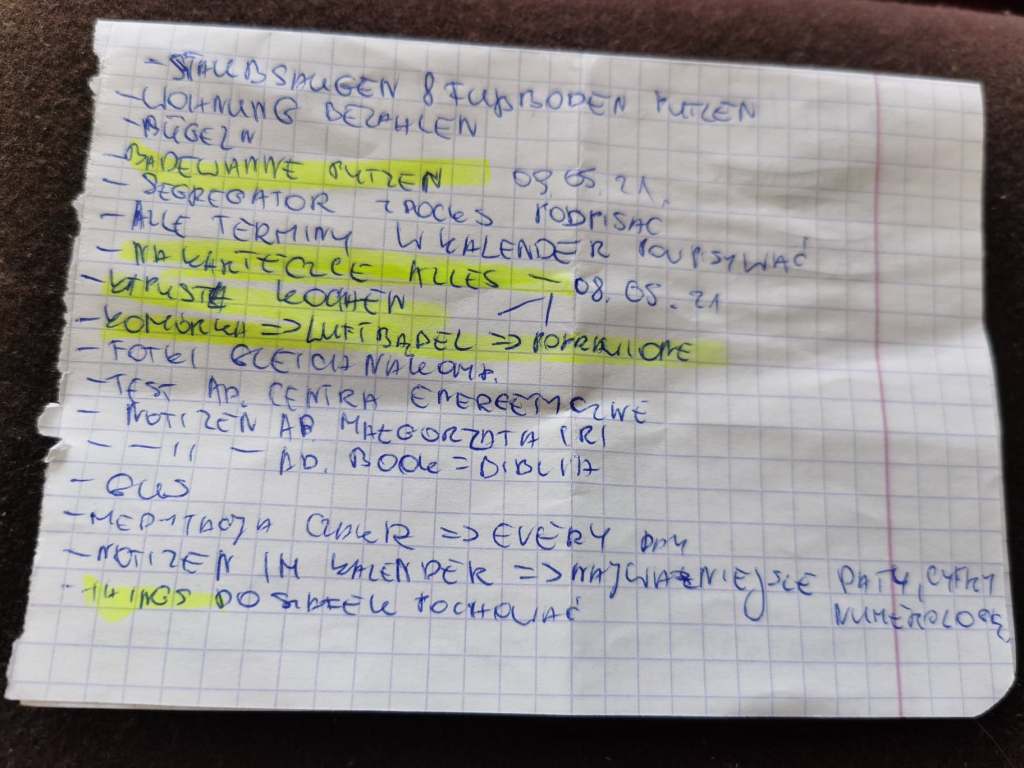 UCZYNIŁAŚ W KOŃCU LISTĘ NA KARTCE, TYCH RZECZY, KTÓRE POWINNAŚ ZROBIĆ, a te które już wykonałaś pozakreślałaś markerem i oznaczyłaś nawet datą!…, tylko patrzę, że pominęłaś tu całkiem ten przedostatni jednak punkt, gdzie już przecież także pozaznaczałaś sobie te wszystkie ważne dla Ciebie daty, jak i cyfry numerologiczne wszystkich ważnych dla Ciebie osób… Nie wzięłaś tu oczywiście pod uwagę Gracjana, bo wciąż nie jesteś pewna jego daty urodzenia… A stwierdziłaś, że zdecydowanie bardziej wolałabyś, aby powiedział ją on Tobie OSOBIŚCIE!