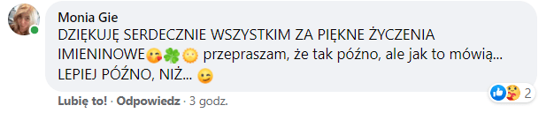 Nie wspominaj już tego nawet… Zrobiłam sobie taki test na fejsie, oczywiście, bo looknęłam, jak moja kuzynka go również wykonała 😜. A tak naprawdę chciałam tylko sprawdzić, cóż tam ciekawego/ innego o tym moim imieniu jest napisane… Tak chciałam sobie to tylko porównać, hehe, bo jak wiesz, ja AŻ TAKIEJ WAGI DO TAKICH GIER NIE PRZYWIĄZUJĘ.. Tzn. nie jest mi to jednak AŻ tak bardzo potrzebne do szczęścia i życia… Bo ja w ogóle odnoszę teraz ponownie wrażenie, że nie umiem już żyć…