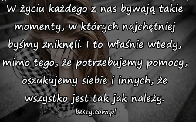 Doskonale to wiem, że czytasz mnie na blogu… Lub może inaczej: tak mi się właśnie wydaje… Wiedz, że ja potrzebuję pomocy, wsparcia, ale naprawdę wcale NIE KOGOŚ, tylko dokładnie TWOJEJ pomocy mi potrzeba, CIEBIE po prostu jeszcze w moim życiu brak… Dobrze to wiem, ile mam do przepracowania… Ale potrzebuję właśnie takiej osoby, jaką Ty jesteś, która by mi pomogła… z tym wszystkim, NIE PROSZĘ CIĘ O WYRĘCZANIE MNIE Z CZEGOŚ, bo dobrze już to wiem, że sama muszę tę pracę wykonać… Tak, m.in. właśnie odnośnie mojej rodzicielki… To jest dla mnie takie cholernie trudne i tak bardzo tego nie rozumiem… a żeby było zabawniej nie mam tu nikogo, kto takie rzeczy byłby w stanie w ogóle pojąć i ogarnąć… Nawet na mojego brata nie mogę tu liczyć, bo on przecież jest młodszy ode mnie i ON WCALE NIE MUSIAŁ TAK BARDZO SIĘ O WSZYSTKO STARAĆ, JAK JA… On był przecież wtedy najpierw jeszcze w brzuchu naszej mamy, a później już jak pojawił się na tym świecie, to był po prostu tym niemowlakiem…