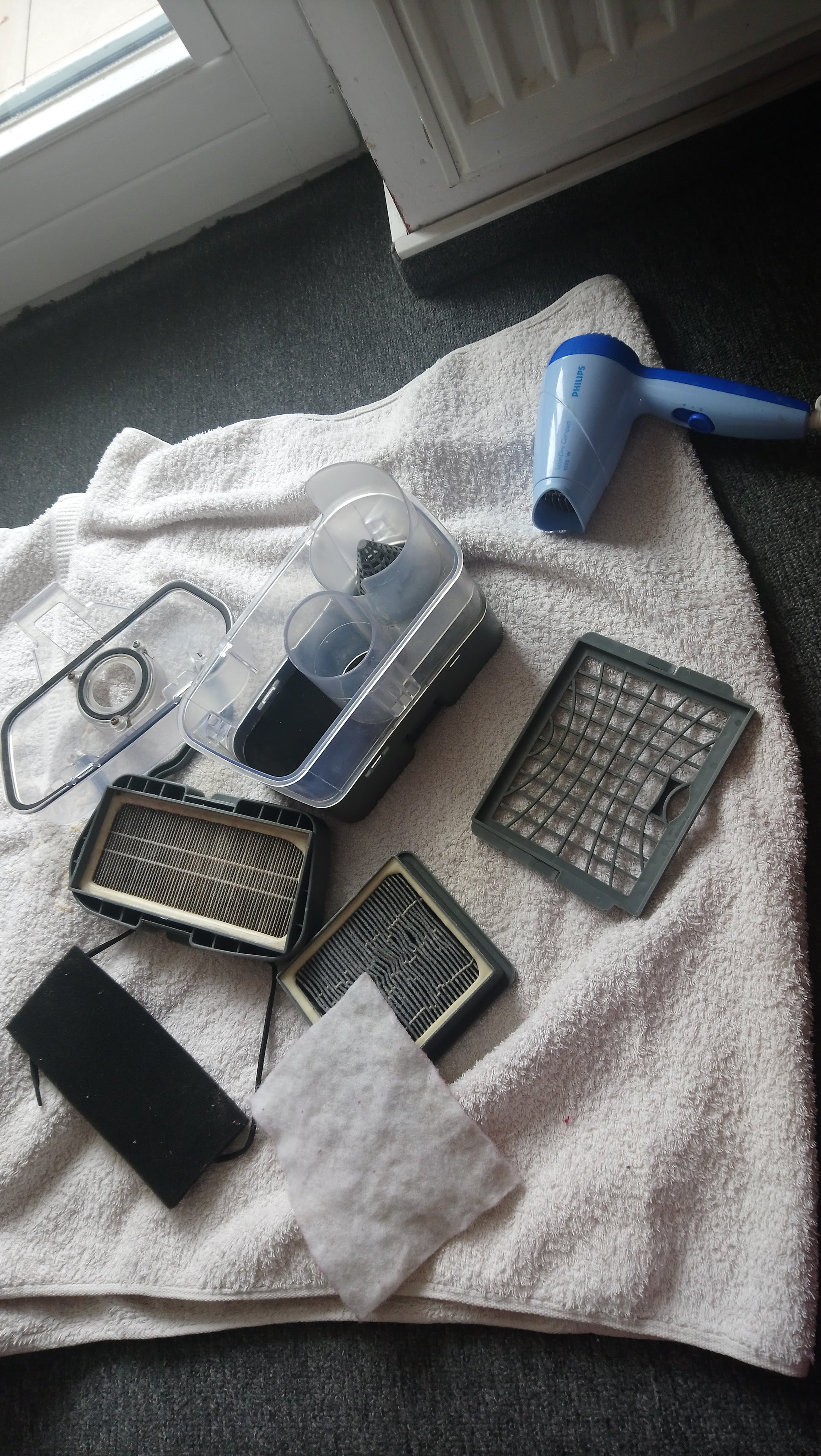 Oczywiście, że kochana moja jest to dla Ciebie zawsze trudnym zadaniem, tym bardziej, że Ty nigdy nie wspomnisz tu nawet o tym, że nie potrafisz być jeszcze tak bardzo sprawna, jak wszystkie zdrowe osoby…, czyli i nie do końca umiesz nadal i tak kucać, i wciąż jednak podnosić się całkiem normalnie z tej podłogi, gdy nawet klęczysz! To tutaj może jeszcze tylko udostępnię fotkę, którą kiedyś zrobiłaś ponownie jeszcze po odkurzeniu i umyciu tego swojego odkurzacza, tutaj widzicie, suszące się te jego wnętrzności:
