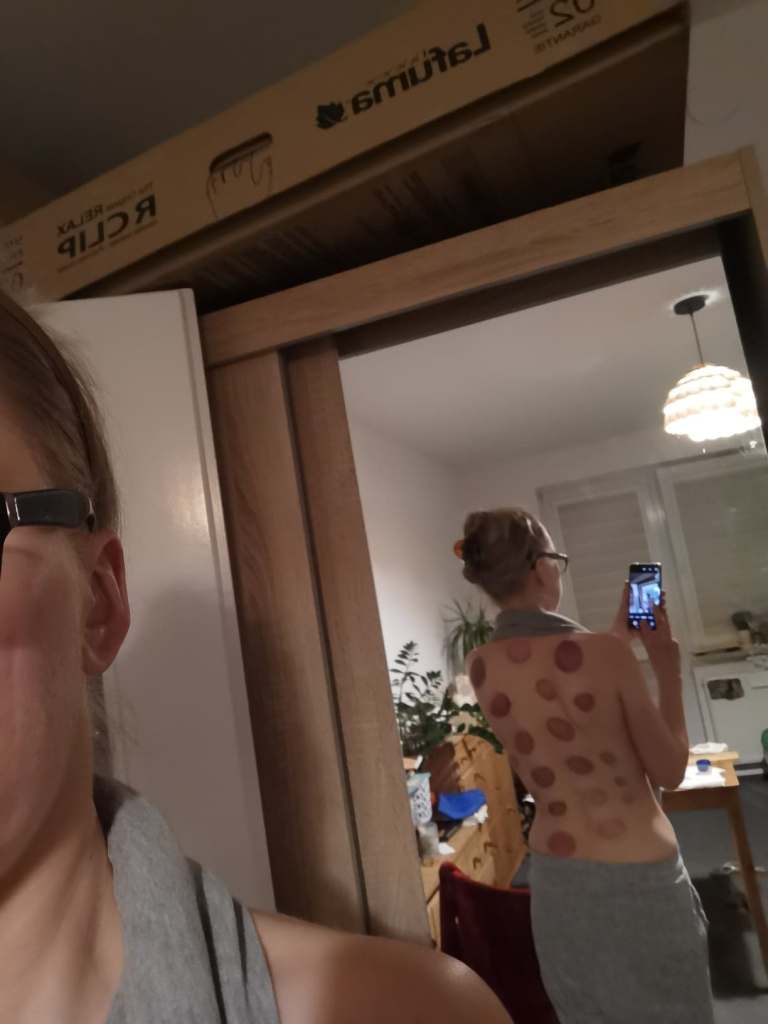 Mała Mi była dziś właśnie odebrać ostatni zabieg, który sobie wykupiła w tym pakiecie, a były to bańki. Nie będzie kryła, że na samym początku bolały ją bardzo te plecy, ale Agnieszka ją o tym uprzedziła, że to uczucie/odczucie jest czymś całkowicie normalnym…, jeśli oczywiście dalej by nie przeszło, to zaczęłaby je naturalnie odrobinę poluźniać. Jednak, jak się domyślacie, później już było spokojniej, nie odczuwała aż takiego napięcia na tych plecach… A oto, jak jej plecy wyglądają, zrobiła tą fotkę dziś, po przyjeździe do domu…, który, kochani ma BAAARDZO znowu nieuprzątnięty, ale więcej się tu wyjaśni, jak będziemy opisywać choćby wczorajszy jej dzień. Celowo wstawiłyśmy tutaj tak duże to zdjęcie [w sensie nie „obrazek w treści”], byście mogli dobrze dostrzec te jej ślady na plecach, które również są czymś normalnym: