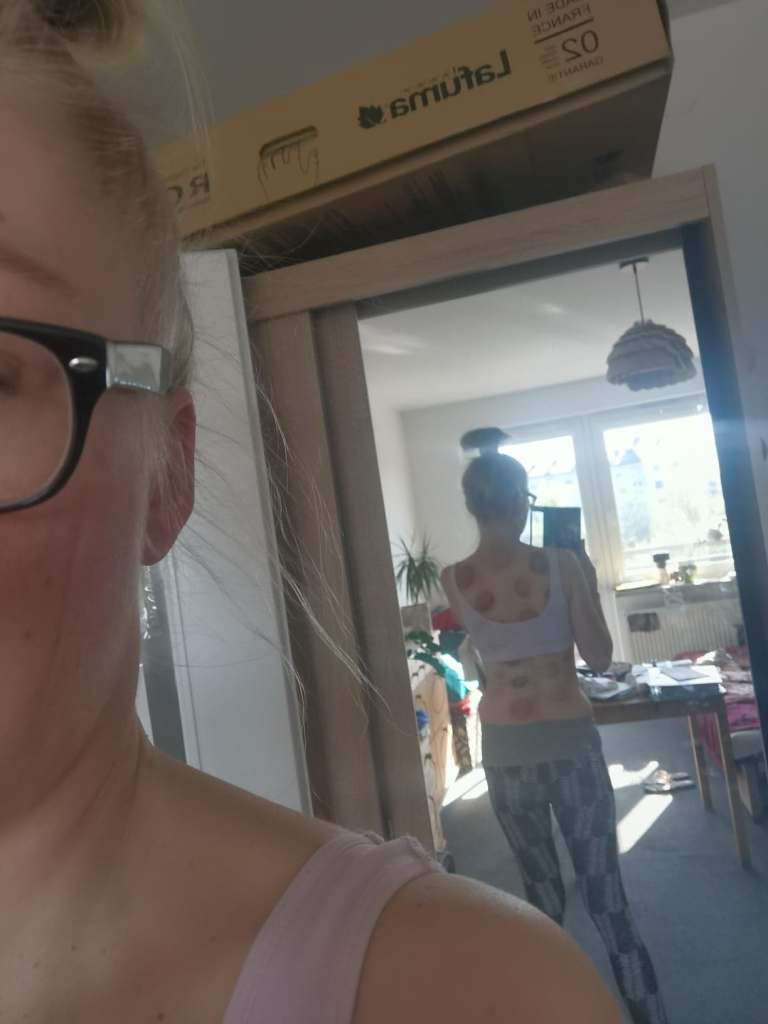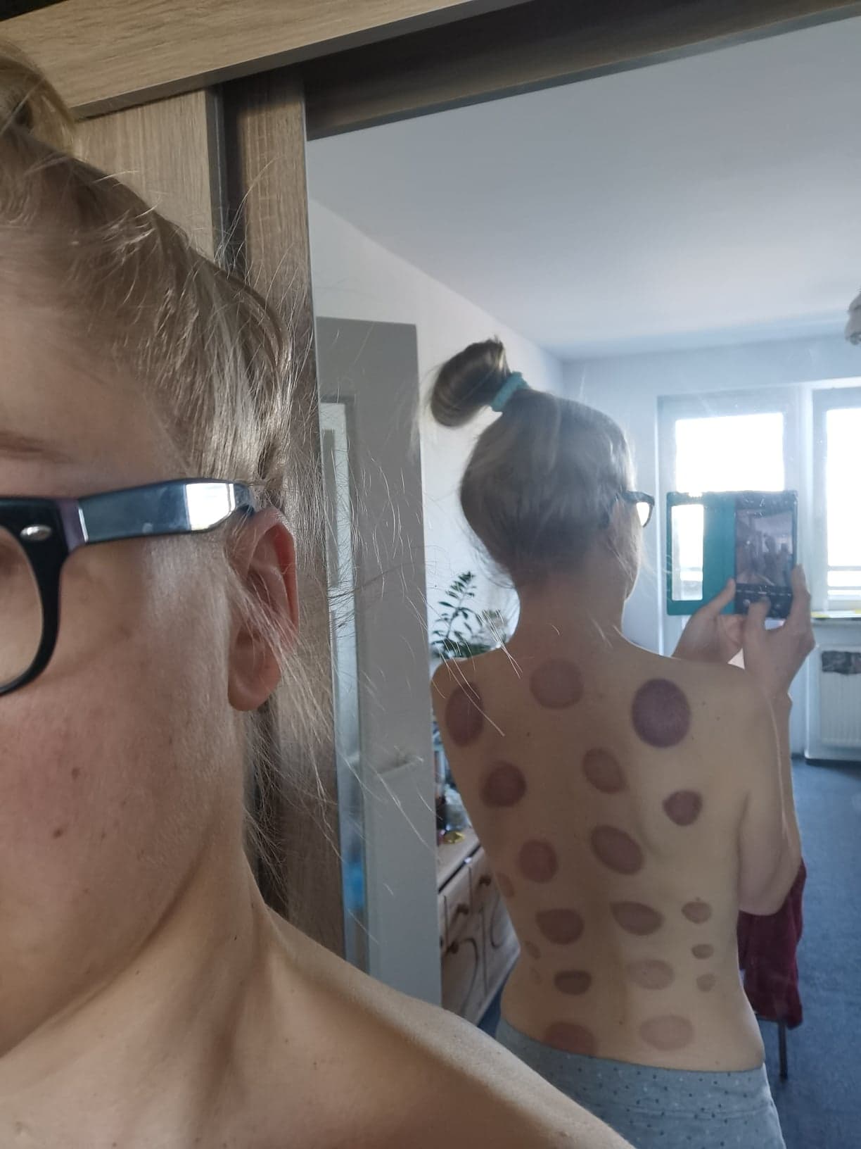 Ta Agnieszka, która stawiała Tobie te bańki rzekła tylko jeszcze, byś obserwowała swoje ciało, lecz na Twoje pytanie, czy możesz się normalnie myć, odpowiedziała, że oczywiście. Nie wspomniała nic jednak o tym, jak długo takie ślady pozostają widoczne, bo z pewnością pomyślała, że skoro o to nie pytasz. to musisz o tym wiedzieć, jak to jest… Ale dobrze widziałam, jaka byłaś właśnie wczoraj wystraszona…, jak chciałaś wziąć jeszcze sobie tą kąpiel w końcu😉. I tak sobie te nieznikające wciąż ślady obserwowałaś…