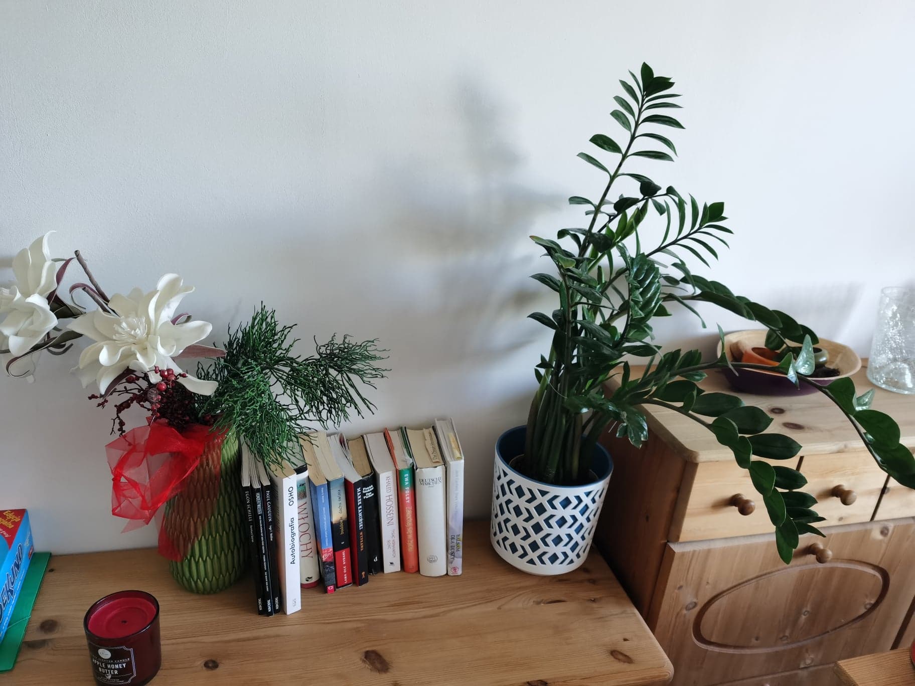 Następnie zaś przeniosłam go z powrotem do pokoju, a tam już pomyślałam, że skoro mam go ustawić ponownie w to miejsce, gdzie wcześniej był…, to z pewnością będzie lepiej, jak najpierw powycieram stamtąd te kurze… I tak, wyobraź sobie, że przetarłam całą tą komódkę! A jeszcze wcześniej naturalnie [w kuchni] powycierałam również mojemu pięknemu kwiatkowi listki! I teraz wygląda on tak: