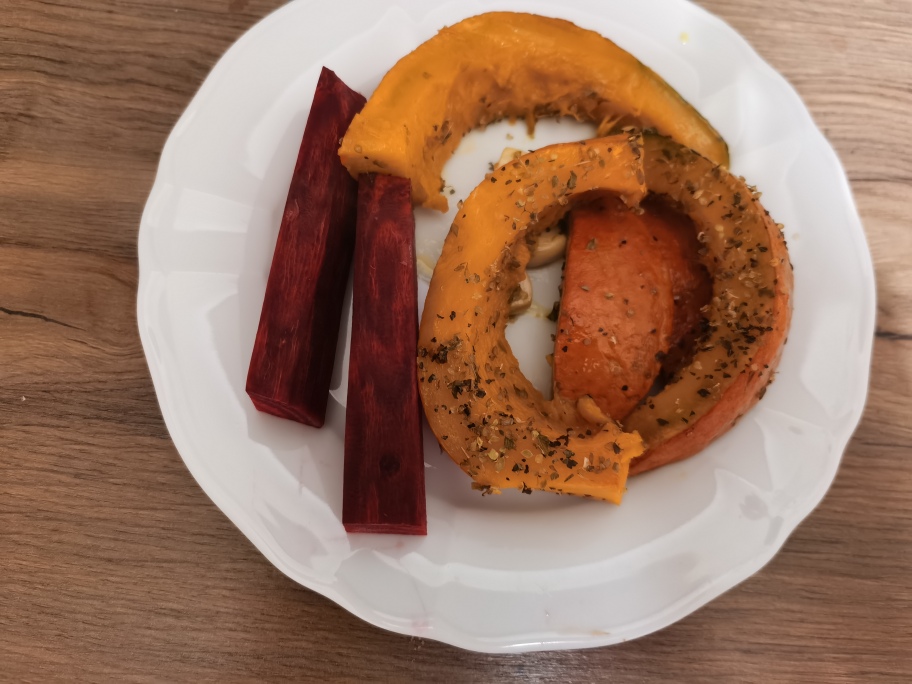 Na tym pierwszym zdjęciu widać już upieczoną tą dynię z czosnkiem… [wciąż parującą, bo świeżo wyjętą z piekarnika :P] i jeszcze surowego, pokrojonego buraka. Kolejna [ta obok fotka] przedstawia już upieczoną tą dyńkę, ale wciąż surowego buraka, bo jak się dowiedziała od p. Piotra, akurat te buraki również można jadać na surowo [czyli dokładnie jak tą dynię hokkaido]. Na dwóch ostatnich zaś zdjęciach jest już wszystko upieczone!