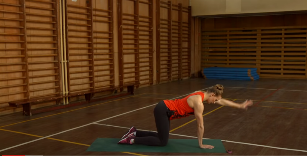A wykonała wszystko przedzielnie! Zrobiła nie tylko yogę, lecz także wszystkie inne ćwiczenia! [brzuszki/ damskie pompki/ dead Bug ‚a/ bieg w miejscu/ wstawanie na jednej nodze (zdjęcie 1sze)…]. I oczywiście jeszcze wiele innych ćwiczeń, lecz tym razem nie zapomniała nawet o przysiadach! Ponieważ tę taśmę, którą zakłada sobie zawsze na uda, w trakcie ich robienia, już sobie przygotowała na widoku, 😉.